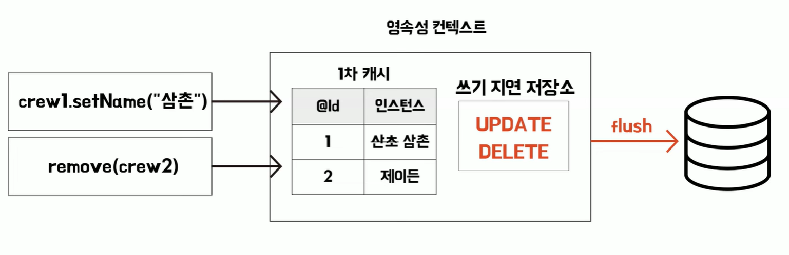 - 엔티티 인스턴스에 대한 쿼리를 바로 DB에 보내지않고 1차 캐시에만 반영한다.