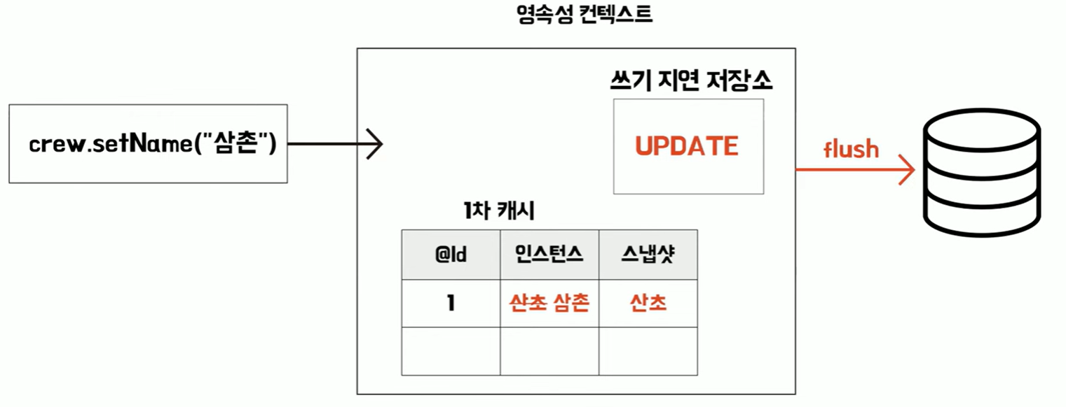 - Flush 하기 전 스냅샷과 현재 상태를 비교해서 쿼리를 쓰기 지연 저장소에 추가한다.