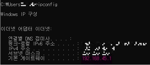 명령 프롬프트에서 "ipconfig"를 입력하면 출력되는 여러 주소 중 "기본 게이트웨이"부분이 SK브로드밴드 공유기 관리 페이지 주소이다.