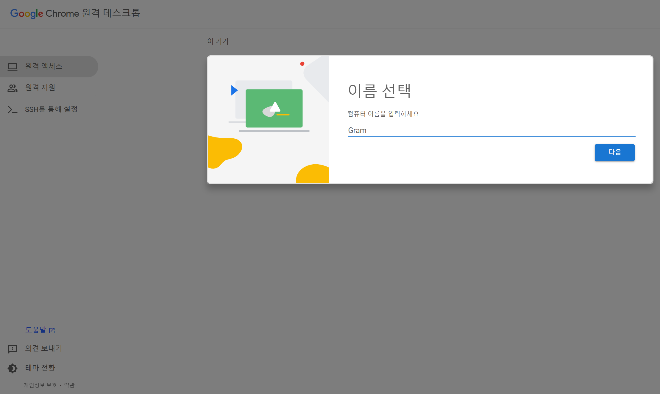 자세한 설치과정은 유튜브나 구글에 "Chrome 원격 데스크톱"이라는 키워드로 검색하면 관련 글이 아주 많이 나온다.